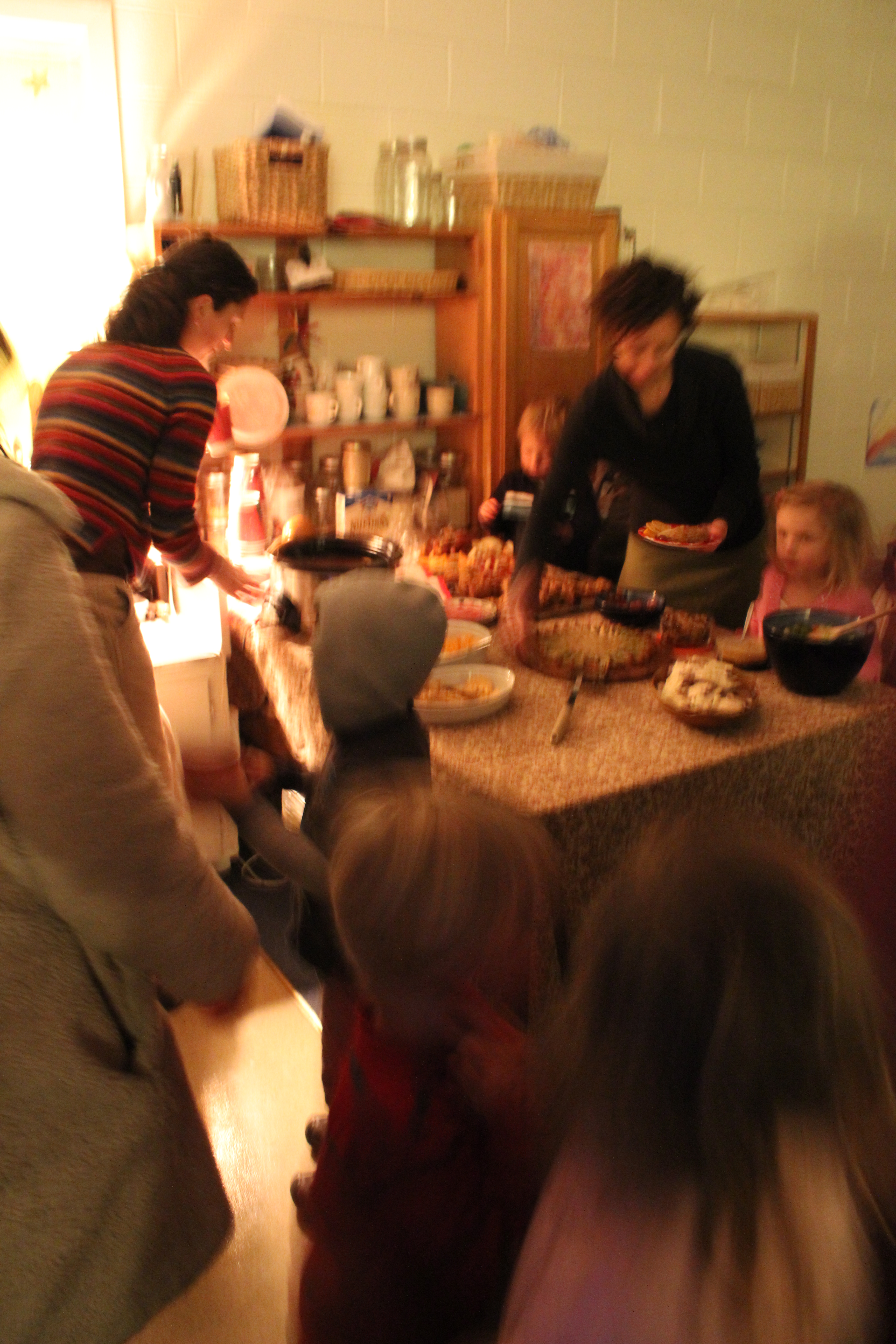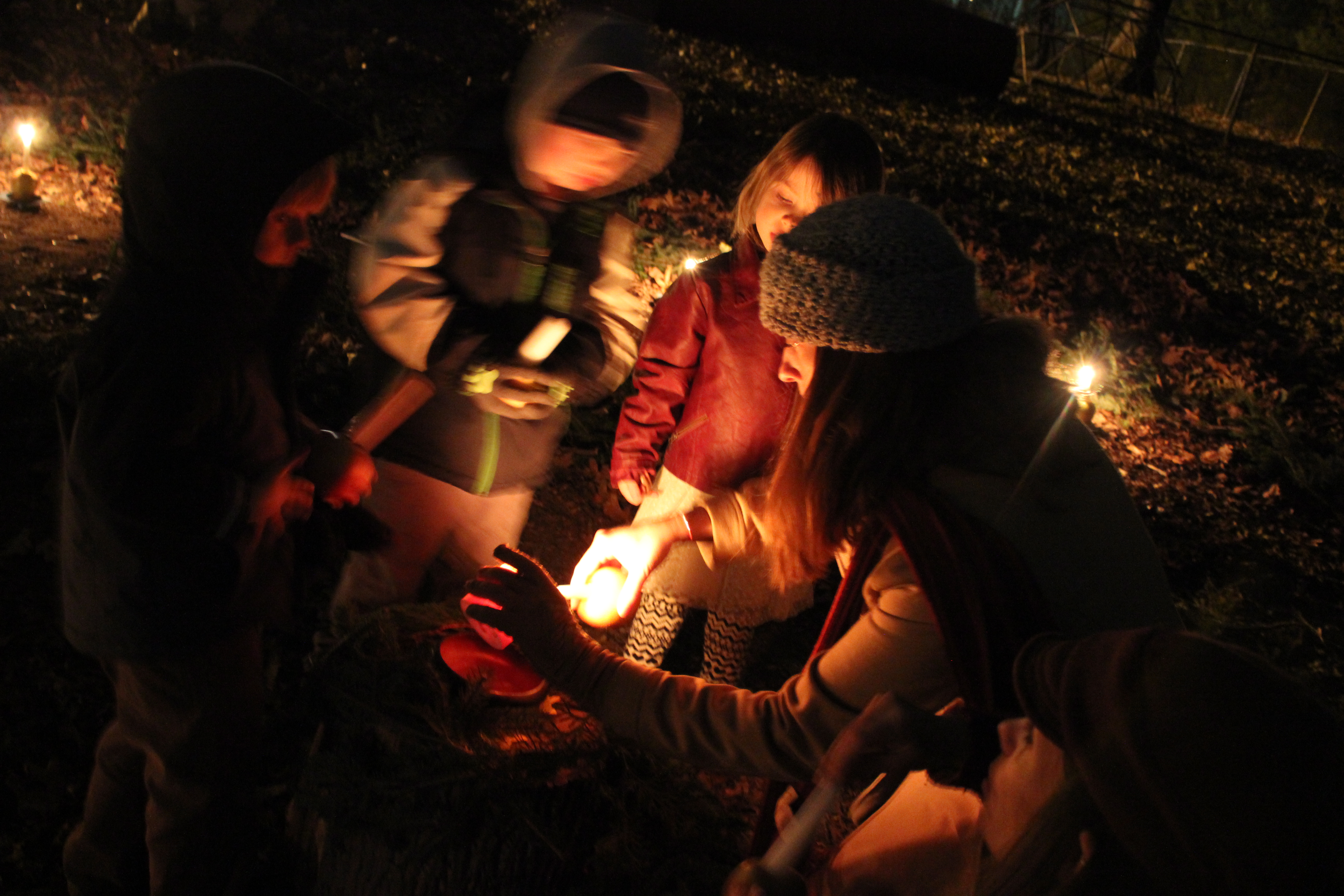 We gathered at school this evening to celebrate the Winter Solstice with a traditional spiral walk to welcome the return of the sun and longer days ahead. The week before the children made lanterns out of watercolor paintings they had made using warm colors of reds and golds. They also decorated the classroom with seasonal foliage and created a table center piece with weekly offerings for the Stone Kingdom, Plant Kingdom, Animal Kingdom, and the Human Kingdom. Tonight we brought offerings for a potluck dinner which was enjoyed after the walk. If you are interested in learning more about spiral walks and other Waldorf inspired Advent traditions, you can read about them here.
