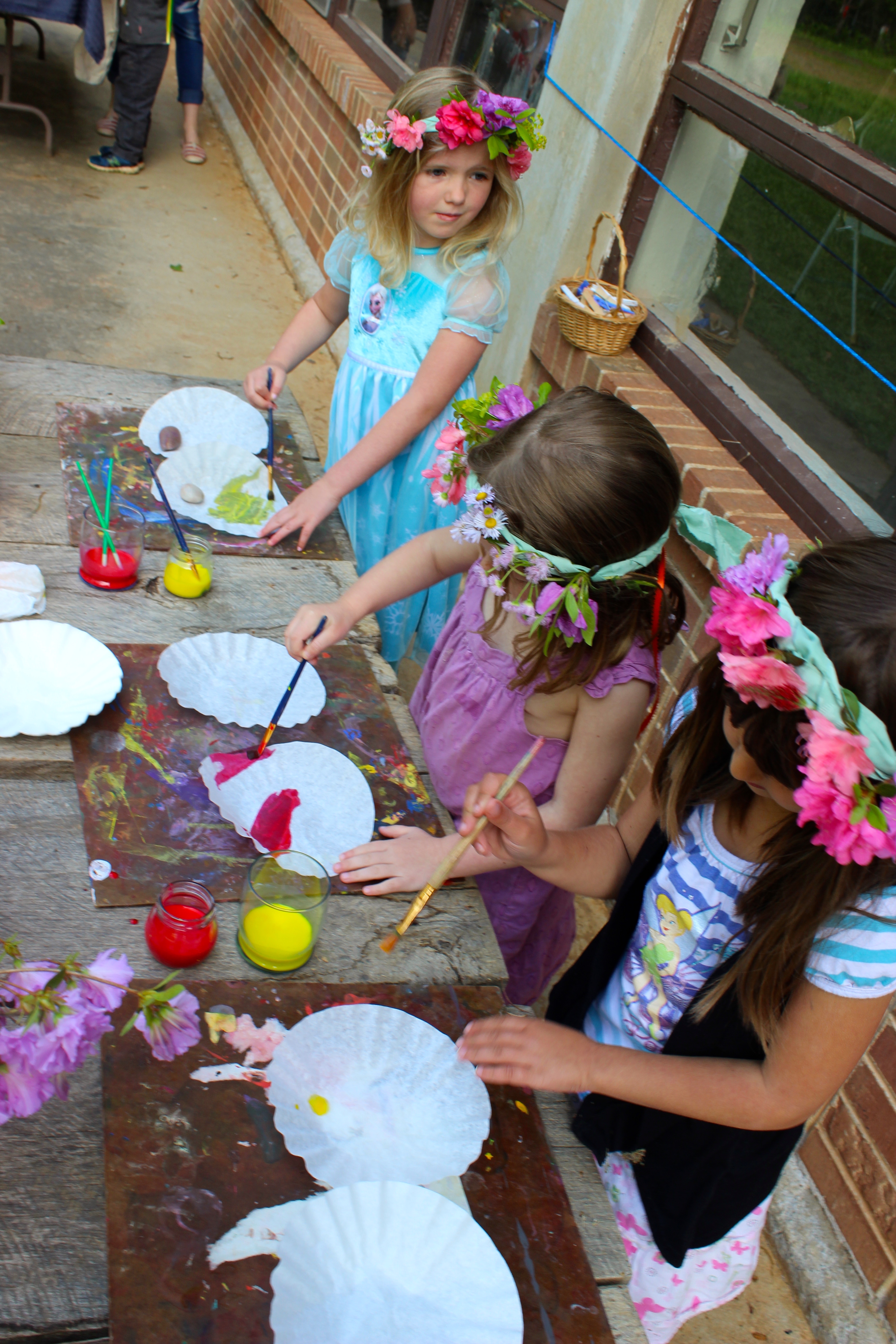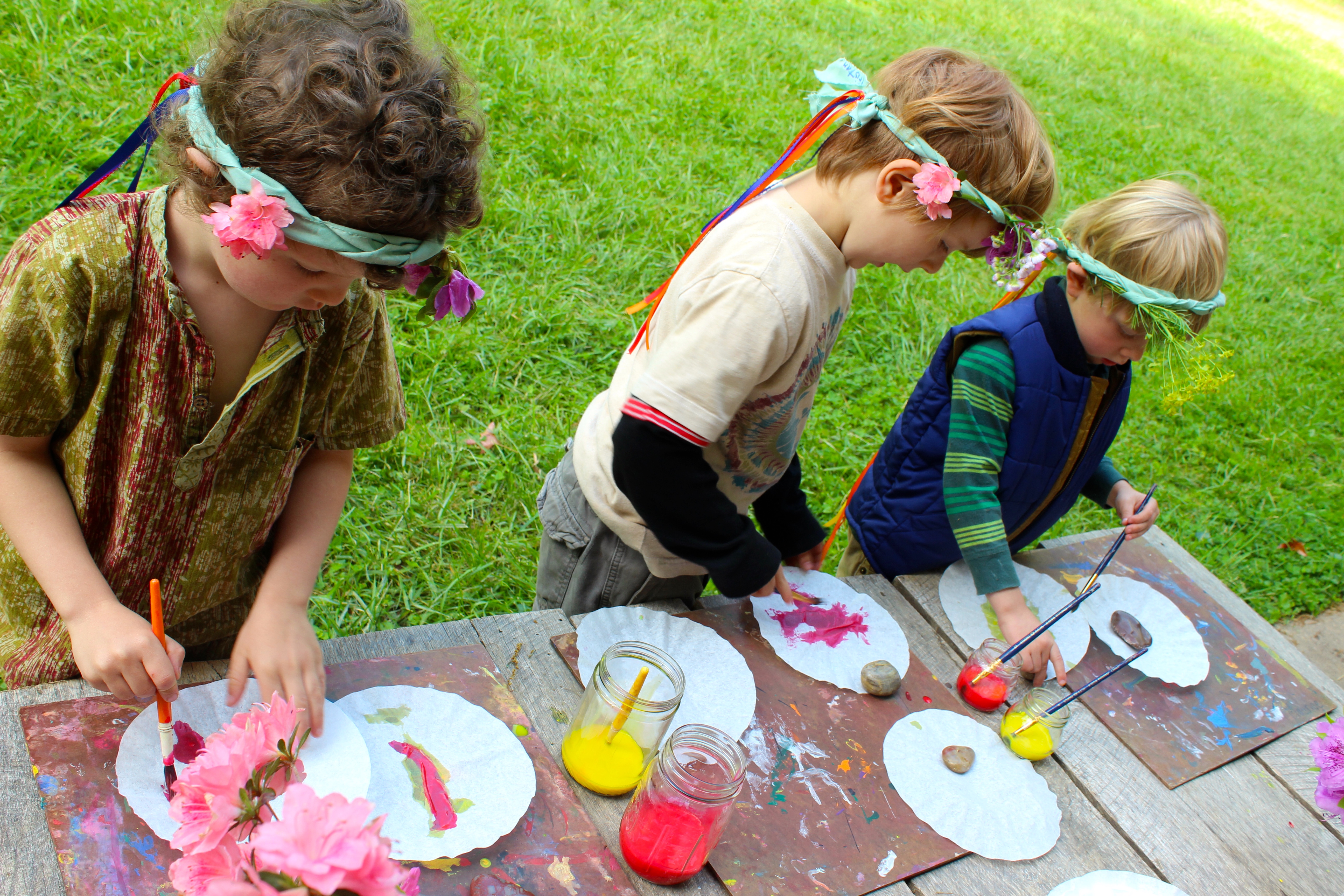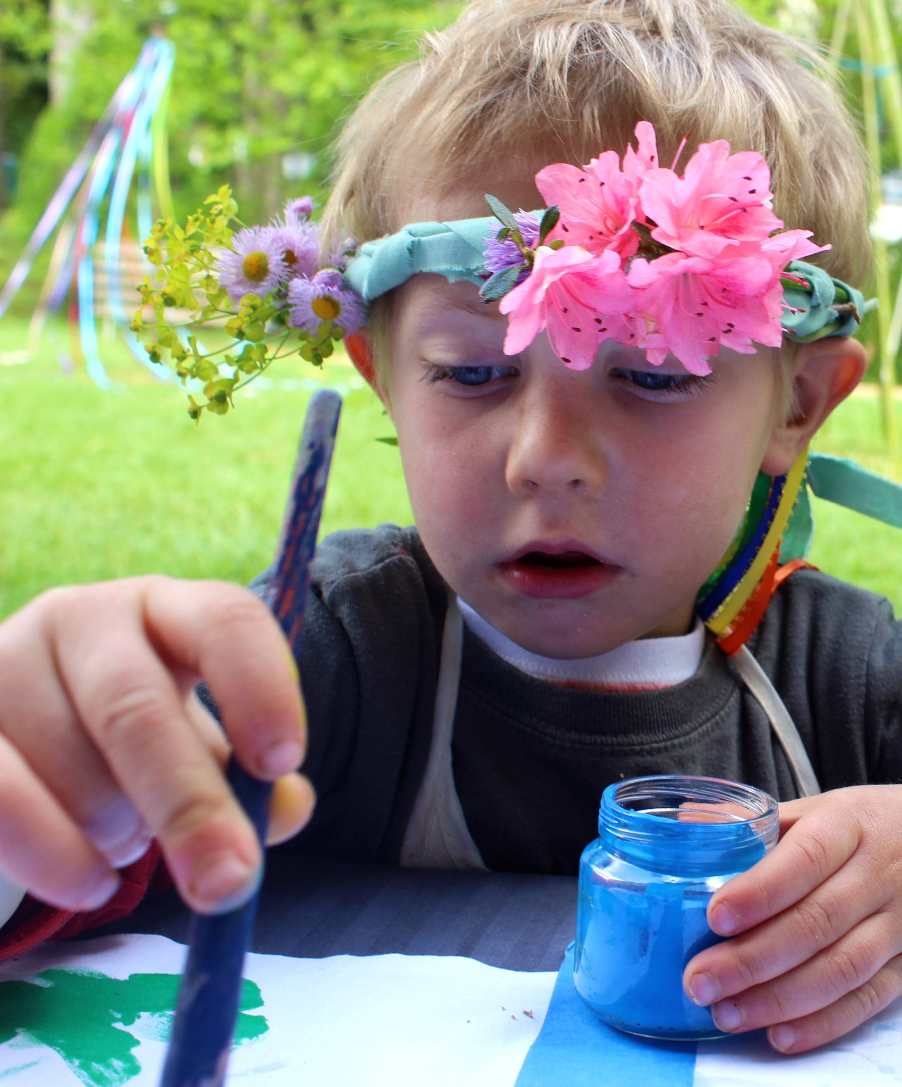 We celebrated May Day this week with a traditional May pole dance, flower crowns and a picnic lunch. The children also painted coffee filters which were turned into clothespin butterflies and wrapped ribbons onto fairy sticks. Children and parents alike painted a canvas which will become our new classroom flag. It was a gorgeous day!
