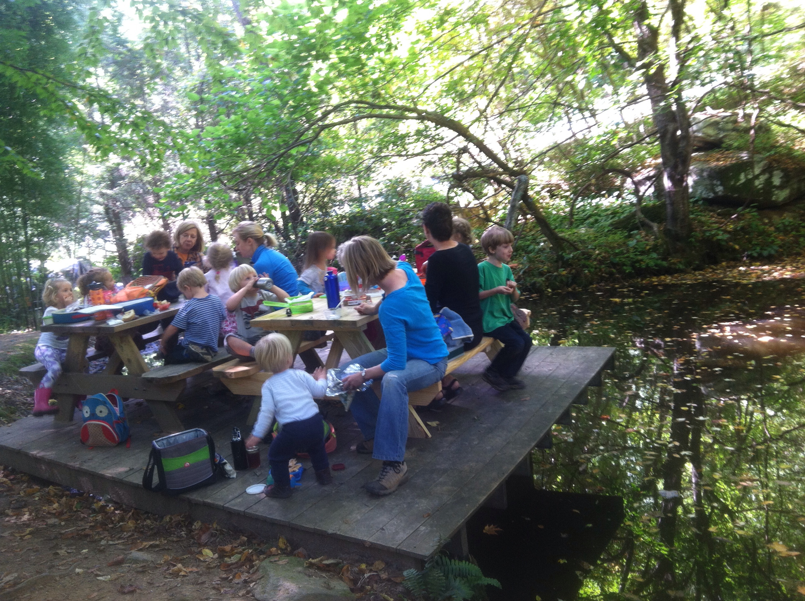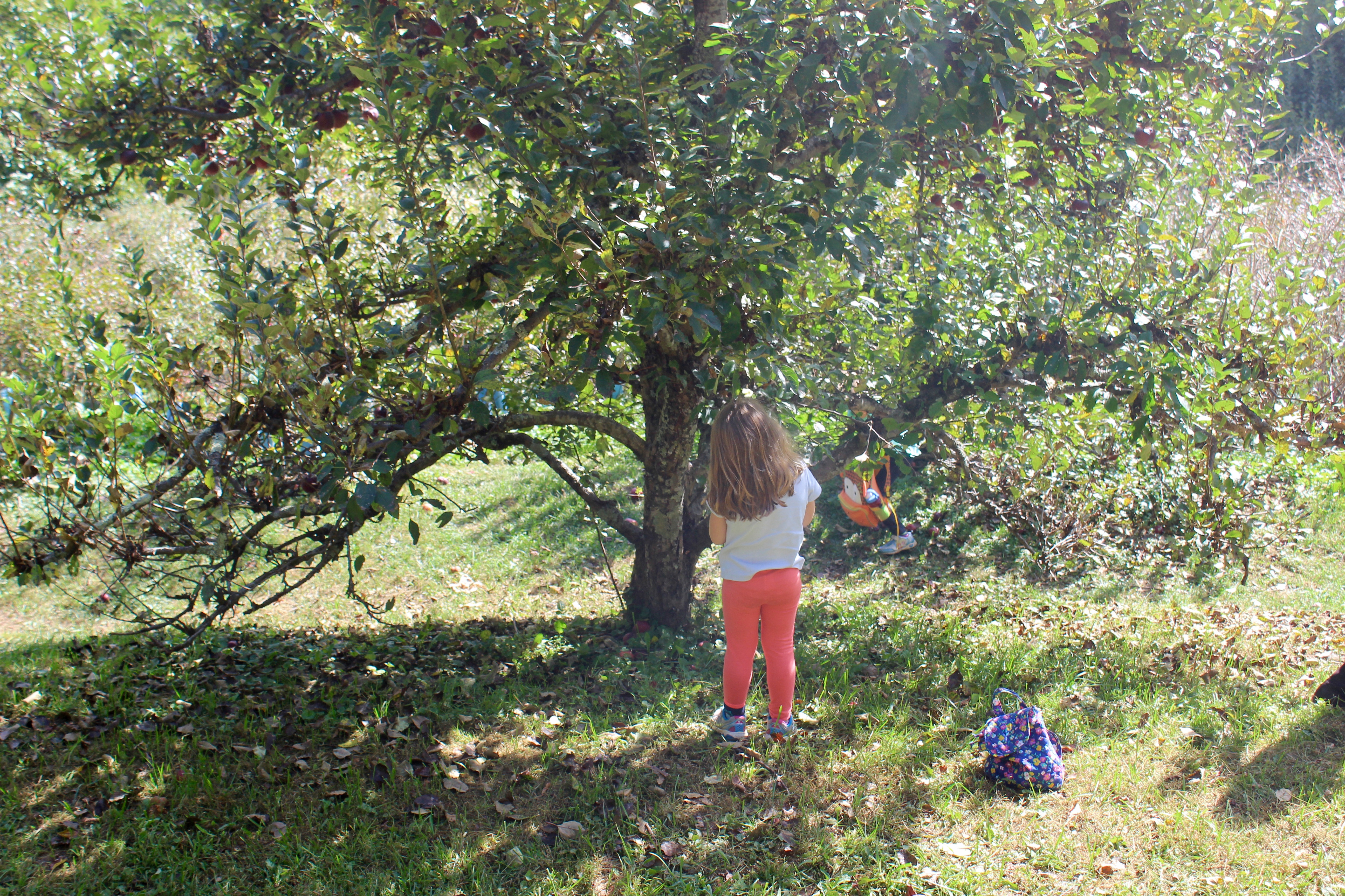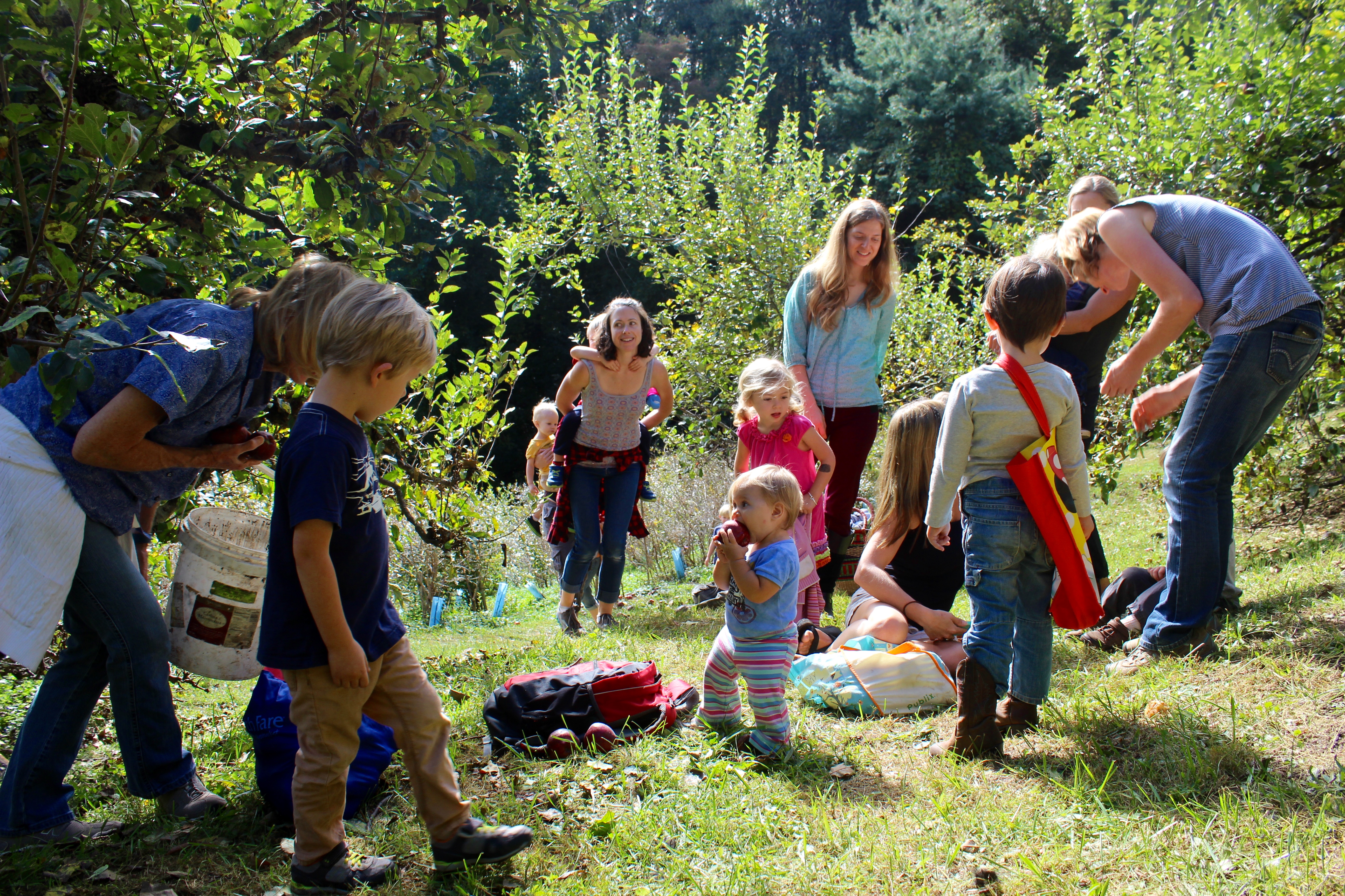 Today we went to the Long Branch Environmental Education Center in Leicester, NC, to pick apples and look for signs of Autumn. Many parents tagged along as well as several smaller siblings. It was a GORGEOUS day! Once we had all arrived, we gathered in front of the main building to have our morning snack which is our weekly loaf of bread made by the children earlier in the week. Afterwards we all headed up the hillside to the orchard where we gathered apples to take home and for making yummy snacks in the classroom next week. Paul, of LBEEC, met us under the trees just as we had filled our baskets and told us the local Native American story of how the mountains and valleys were made by the wings of the turkey vultures. Then Ms. Katy told us Susan Down‘s story of how apples got a star inside to house their seeds. Afterwards we sang apple songs while passing around yummy apple pieces which Ms. Katy cut up for everyone. While we were walking back down the hill to the picnic tables to eat lunch we came across a friendly black garden snake. We left him to bask in the sunshine while we ate our lunches and said goodbye. It was a great day and we look forward to going again next year!