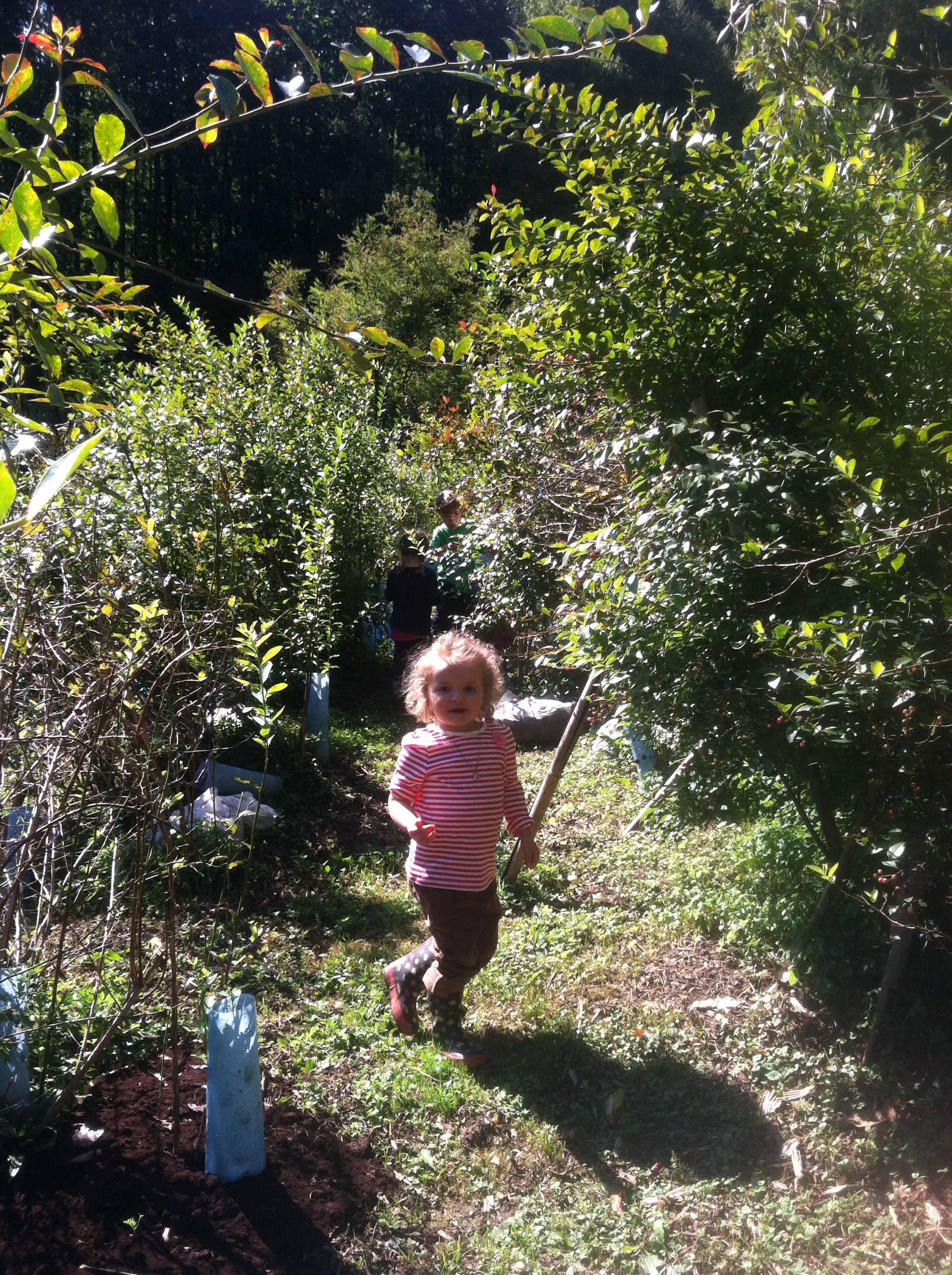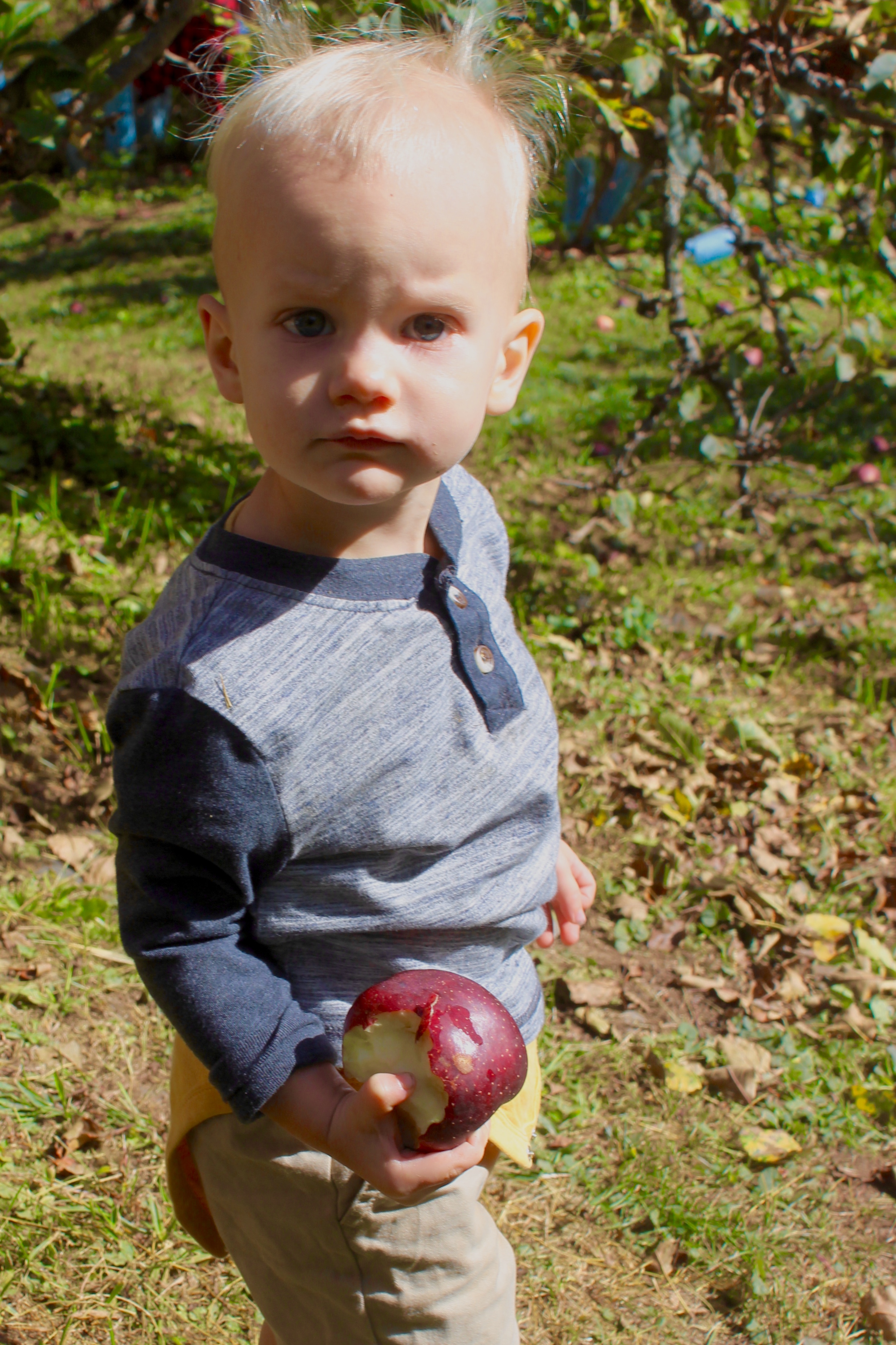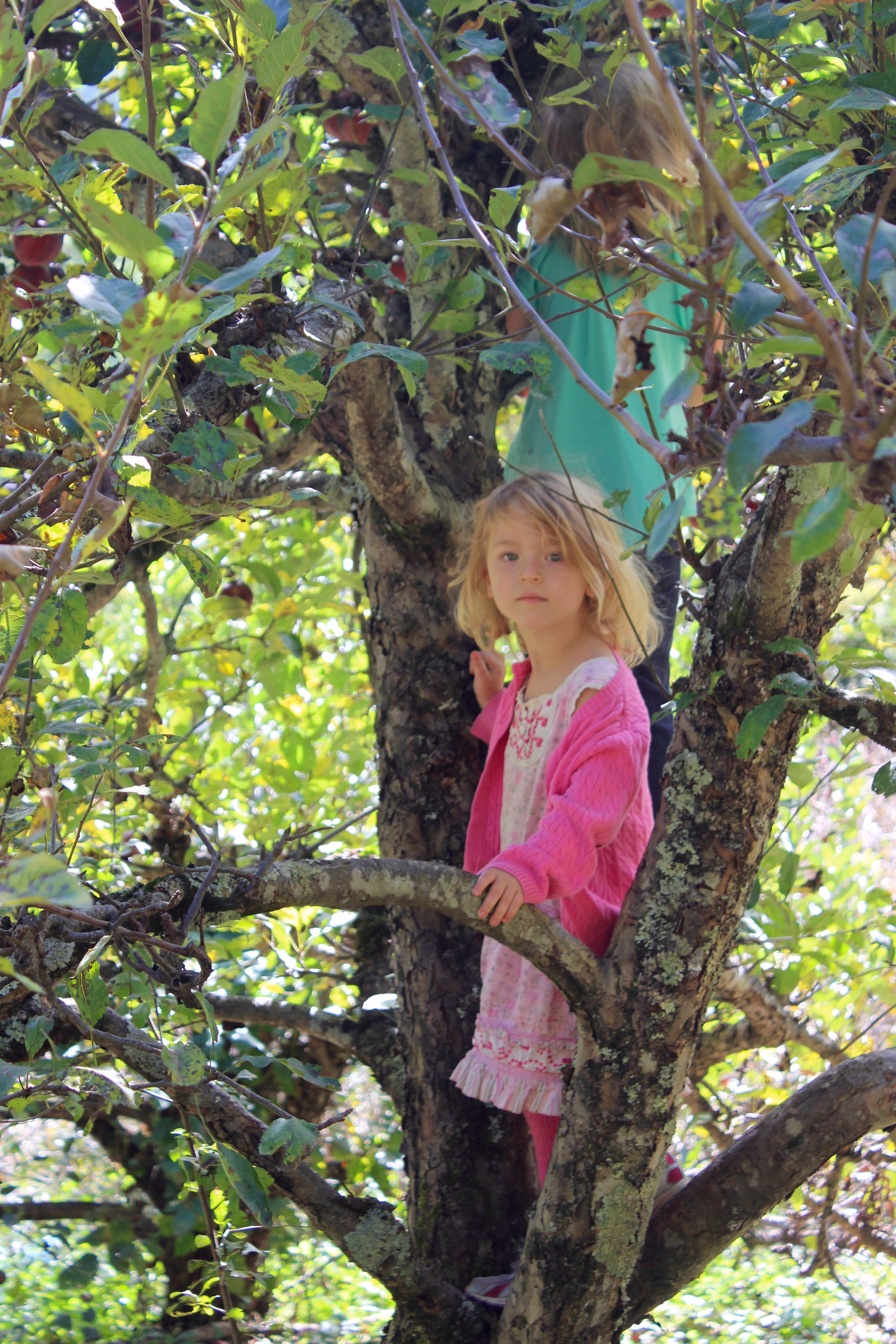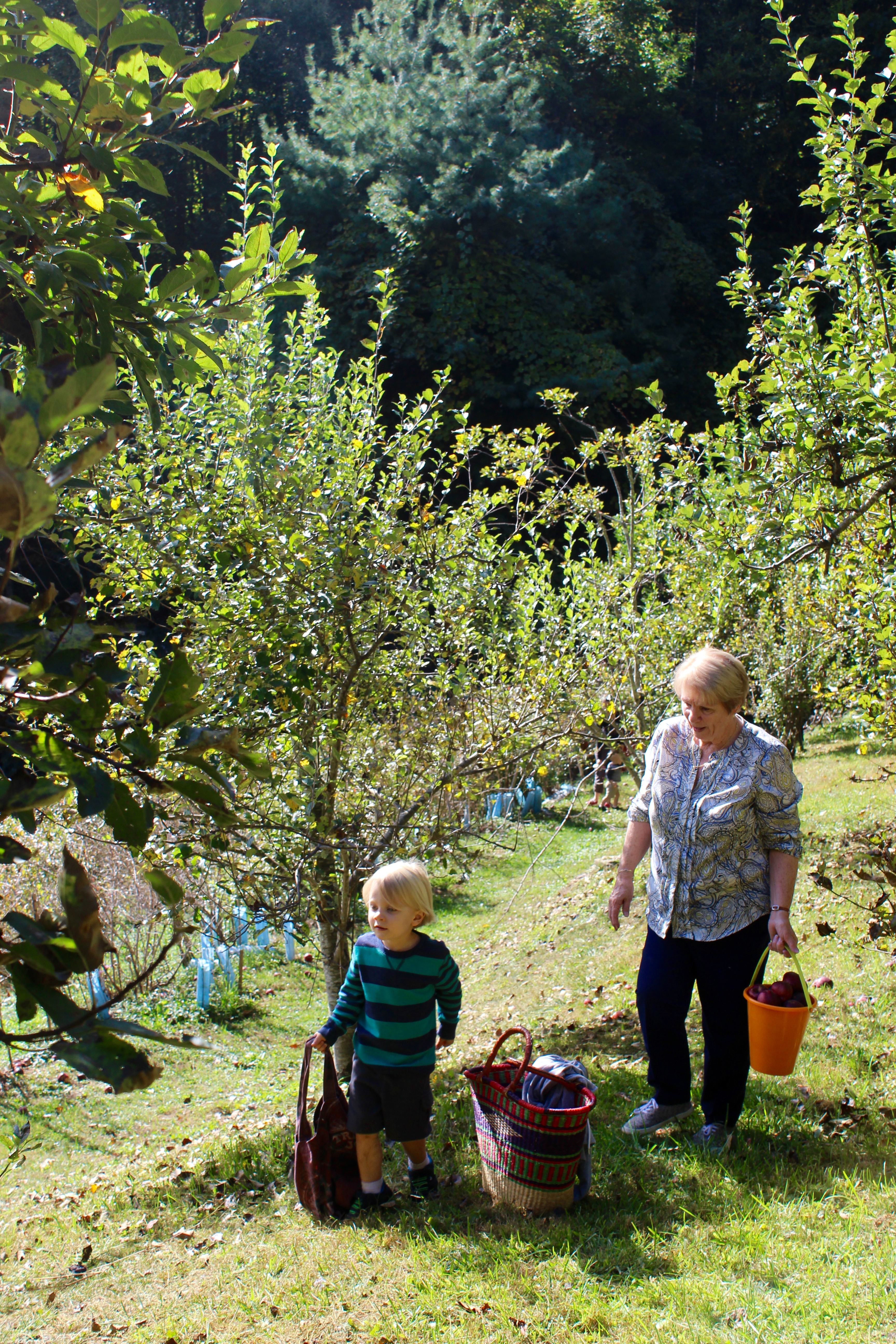 Today we went to the Long Branch Environmental Education Center in Leicester, NC, to pick apples and look for signs of Autumn. Many parents tagged along as well as several smaller siblings. It was a GORGEOUS day! Once we had all arrived, we gathered in front of the main building to have our morning snack which is our weekly loaf of bread made by the children earlier in the week. Afterwards we all headed up the hillside to the orchard where we gathered apples to take home and for making yummy snacks in the classroom next week. Paul, of LBEEC, met us under the trees just as we had filled our baskets and told us the local Native American story of how the mountains and valleys were made by the wings of the turkey vultures. Then Ms. Katy told us Susan Down‘s story of how apples got a star inside to house their seeds. Afterwards we sang apple songs while passing around yummy apple pieces which Ms. Katy cut up for everyone. While we were walking back down the hill to the picnic tables to eat lunch we came across a friendly black garden snake. We left him to bask in the sunshine while we ate our lunches and said goodbye. It was a great day and we look forward to going again next year!