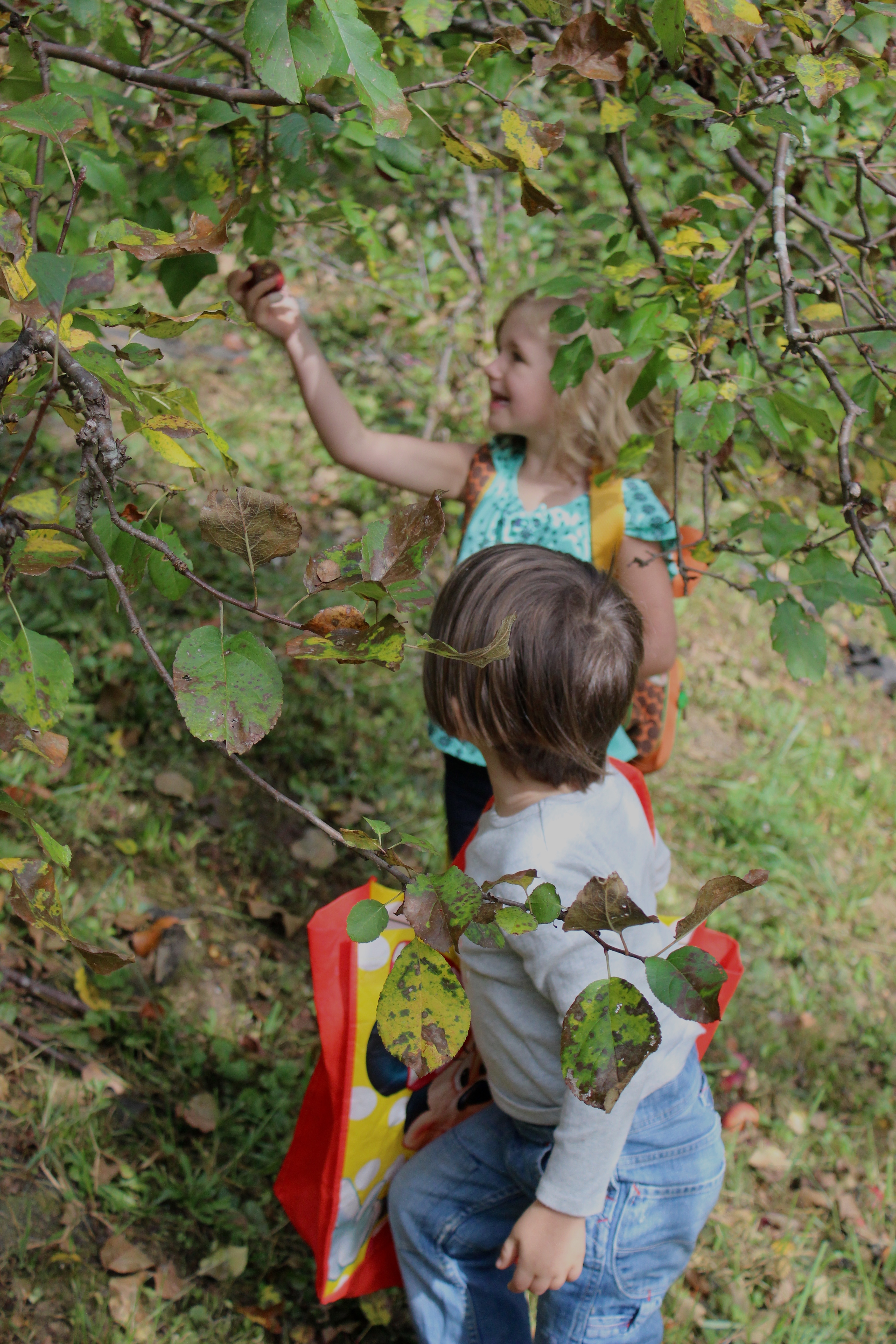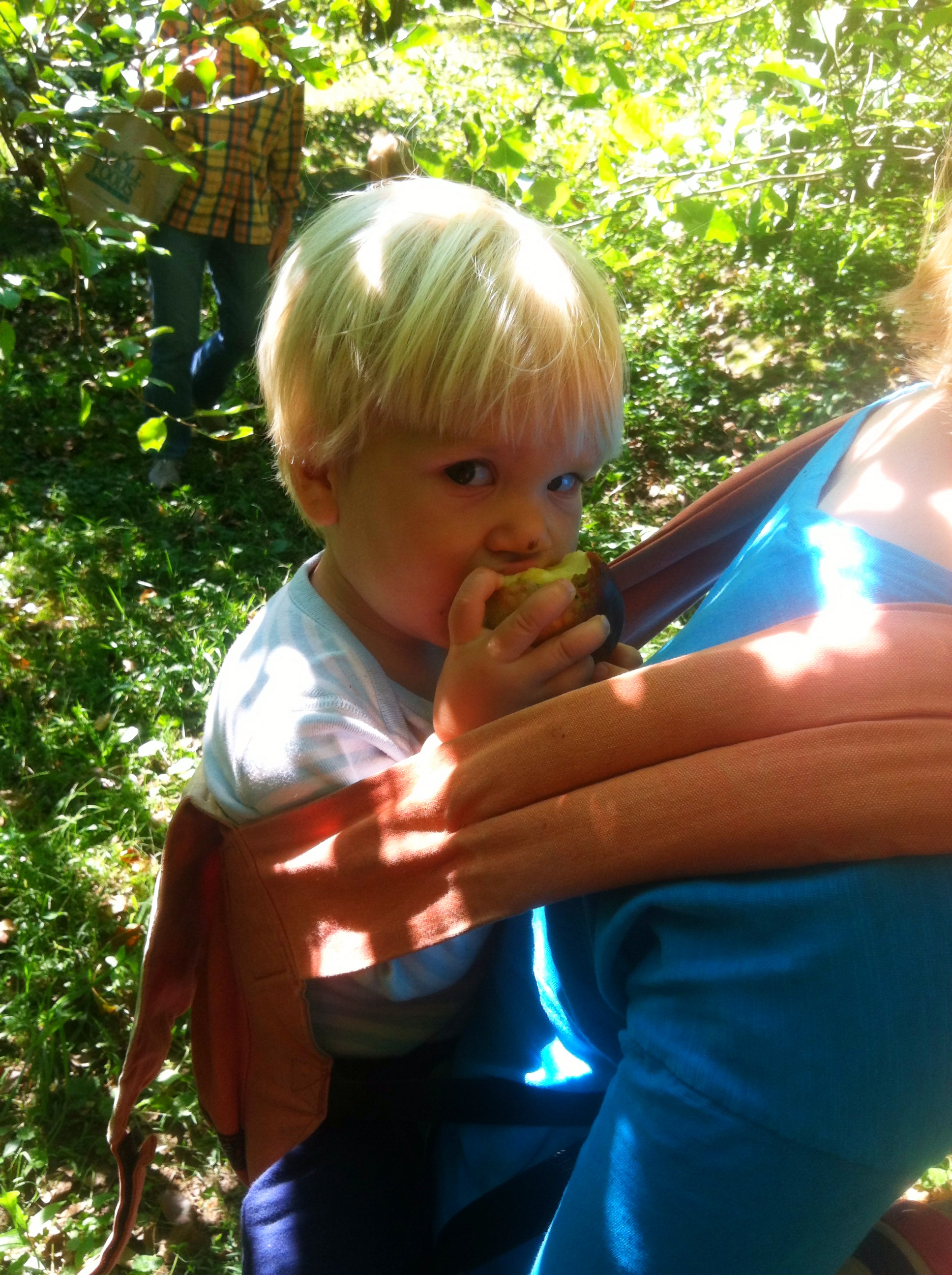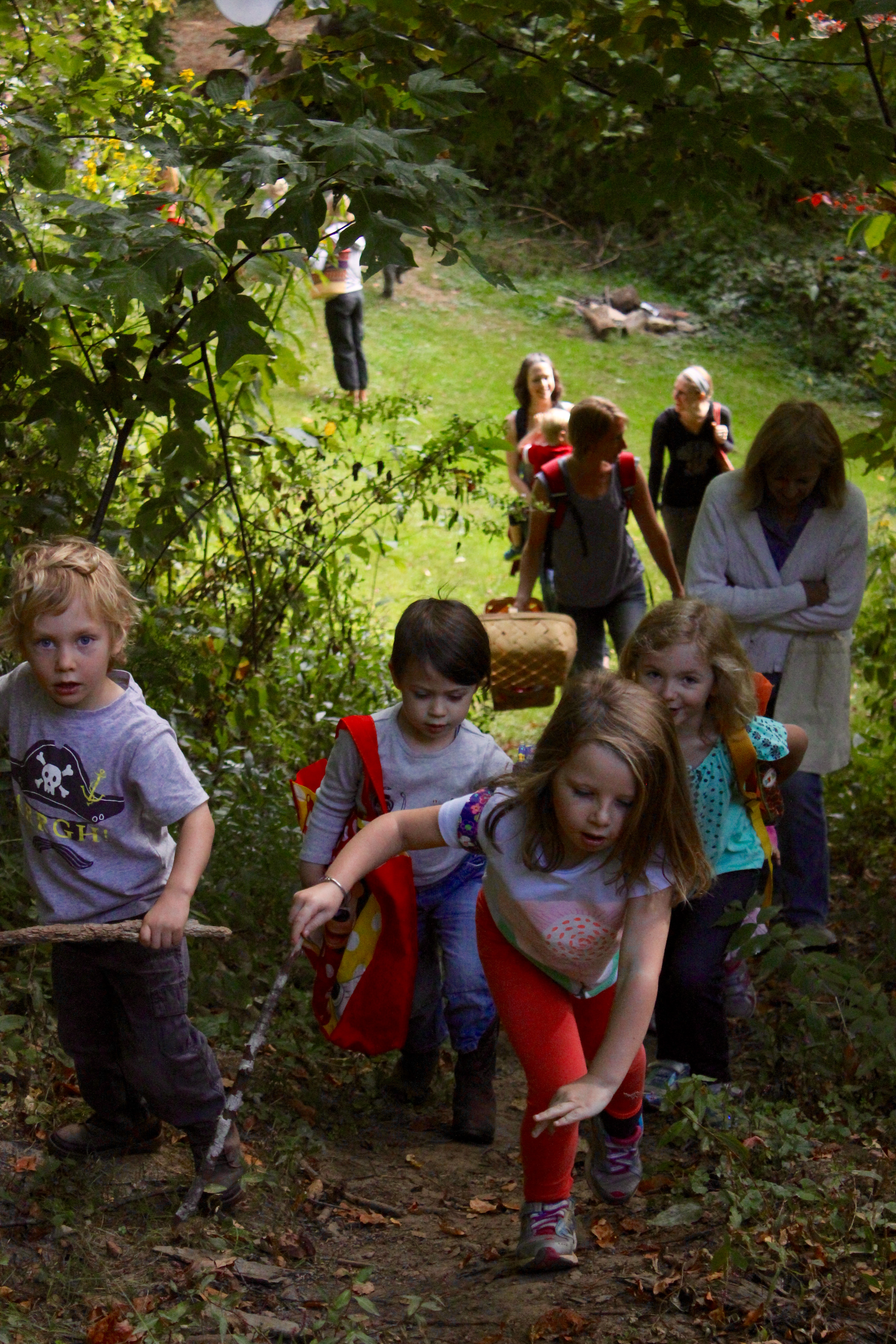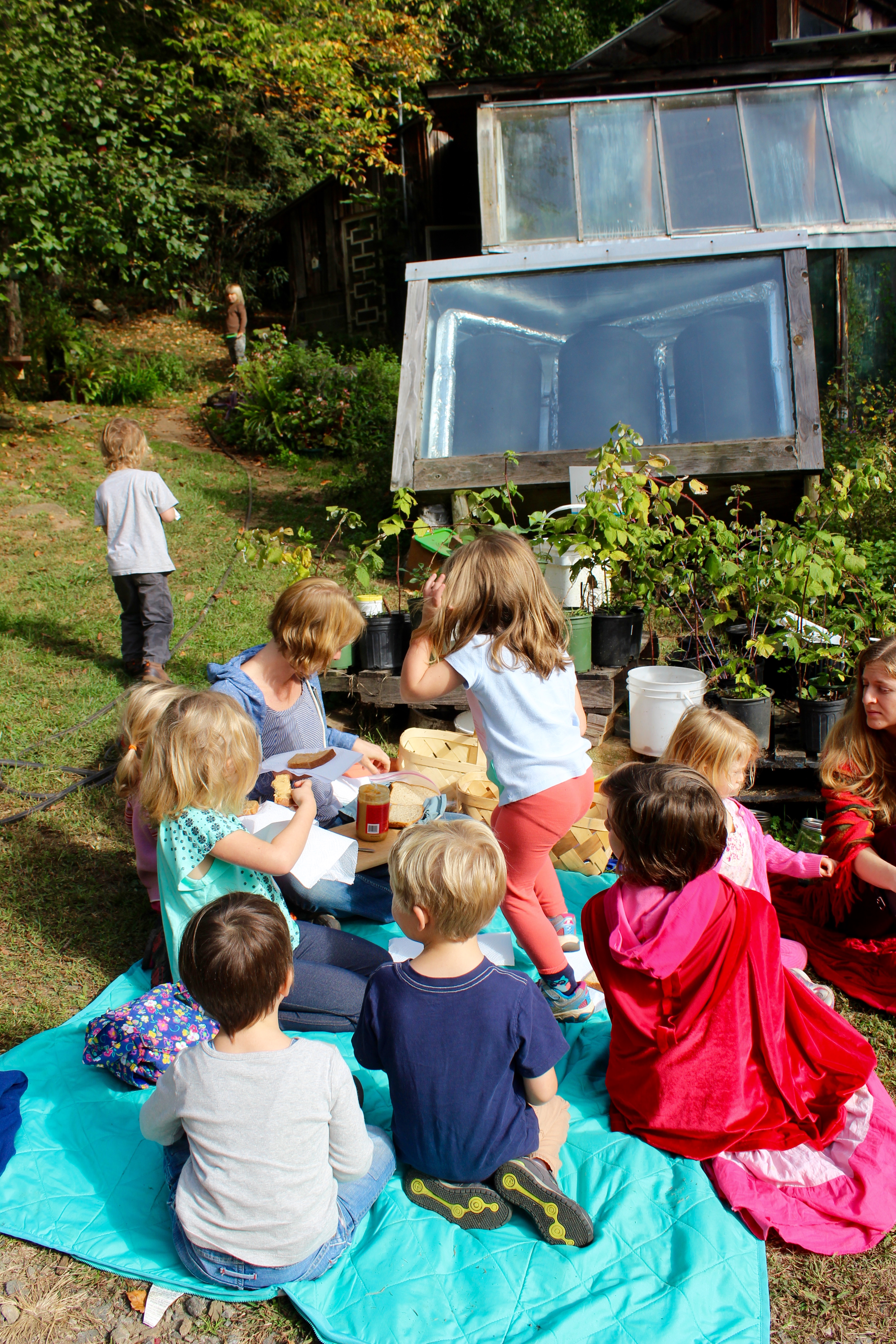 Today we went to the Long Branch Environmental Center for a day of apple picking. It was a gorgeous fall day and the dappled light coming through the trees was magical! After we had gathered apples to our hearts’ content, we sat in a circle to listen to Ms. Katy tell the story of The Red House with No Doors, No Windows, and a Star Inside. Then we headed down the hillside for a little berry picking, too. Afterwards we gathered at the pond for a picnic lunch before heading home.